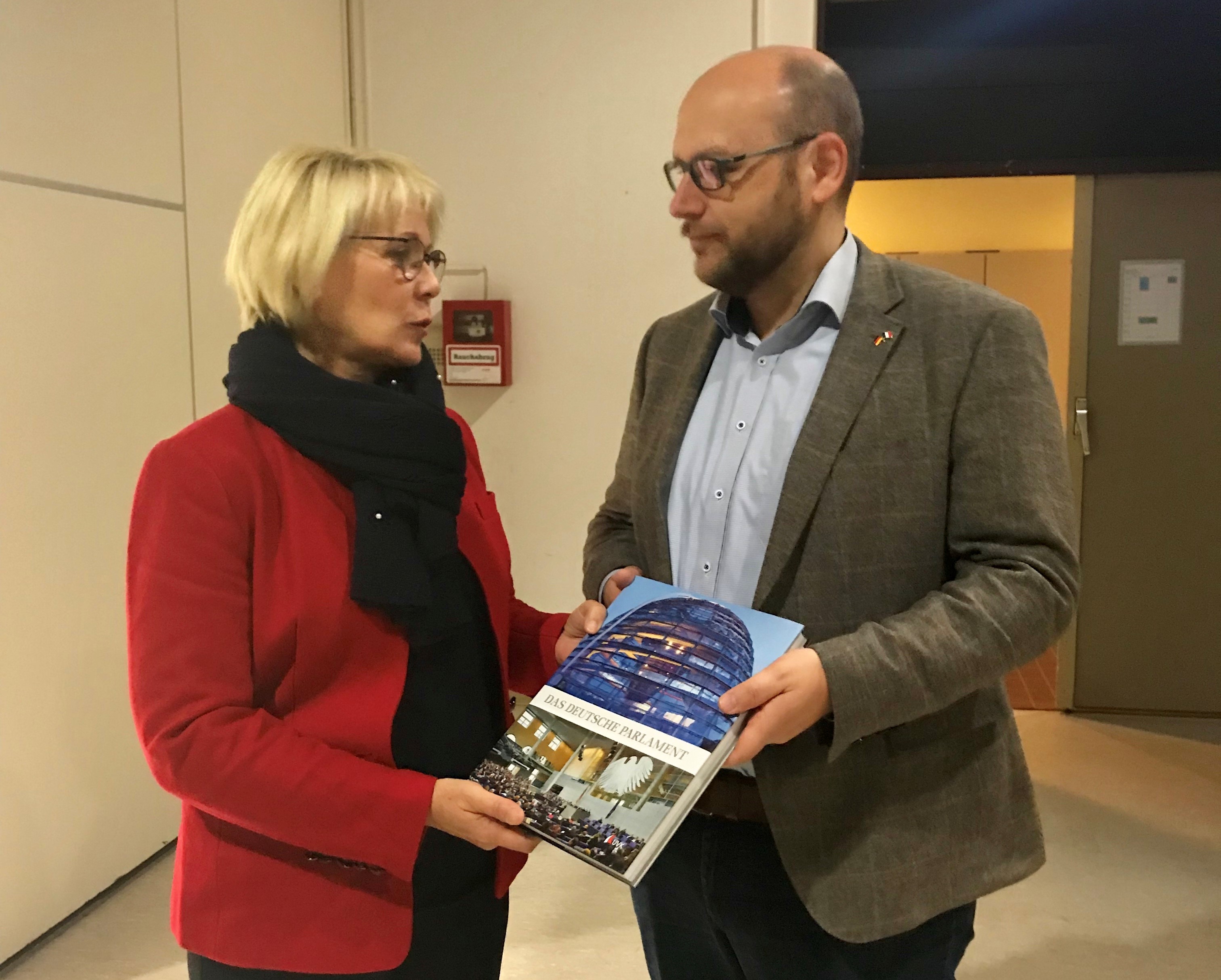 ...ich mich sehr freue, die Wanderausstellung des Deutschen Bundestages begrüßen zu können, die auf meine Initiative hin, hier in der Gemeinschaftsschule Heide-Ost zu Gast ist,. Sie ist bestimmt eine gute und abwechslungsreiche Ergänzung zum Politikunterricht“. Mit diesen Worten begrüßte die Bundestagsabgeordnete für Nordfriesland und Dithmarschen-Nord die Schülerinnen und Schüler der Klasse 10b der gastgebenden Gemeinschaftsschule in Heide und eröffnete damit die Ausstellung. Nicht jedoch, ohne zuvor dem Direktor Matthias Claussen für die zur Verfügungsstellung der Räumlichkeiten ganz herzlich zu danken und ihm ein Bildband über den Deutschen Bundestag für die Schulbibliothek zu überreichen.