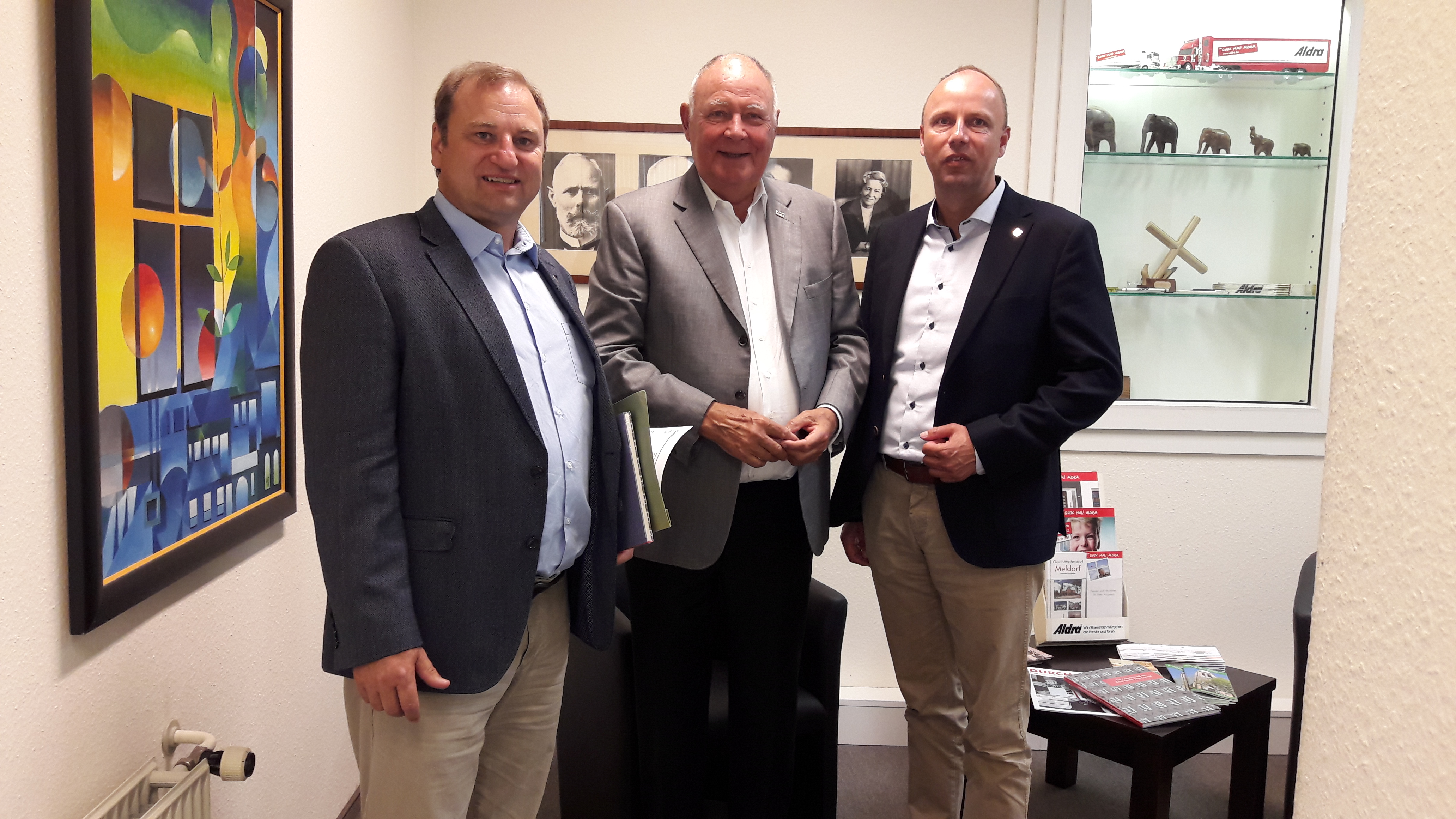 Meldorf: Die beiden Dithmarscher CDU Landtagsabgeordneten Andreas Hein und Volker Nielsen informierten sich im Rahmen ihrer Sommertermine bei Senior-Chef Peter Albers über Entwicklung und Lage der Aldra-Gruppe. Zunächst gratulierten die Politiker Peter Albers zum 50. Jährigen Jubiläum als Geschäftsführer des deutschlandweit bekannten Fenster- und Türenherstellers. „Dem großen Engagement in Wirtschaft, Politik, Regionalentwicklung und Kultur des standhaften Dithmarscher Unternehmers Albers zollen wir großen Respekt und Anerkennung“, so CDU Kreisvorsitzender Volker Nielsen. Neben der Führung der Aldra Gruppe ist Peter Albers seit Jahrzehnten in vielen Interessenverbänden aktiv, wobei er immer auf die Stärken seines Heimatkreises Dithmarschen hinweist. „Sie sind ein bedeutender Botschafter unseres Kreises“, so Andreas Hein.