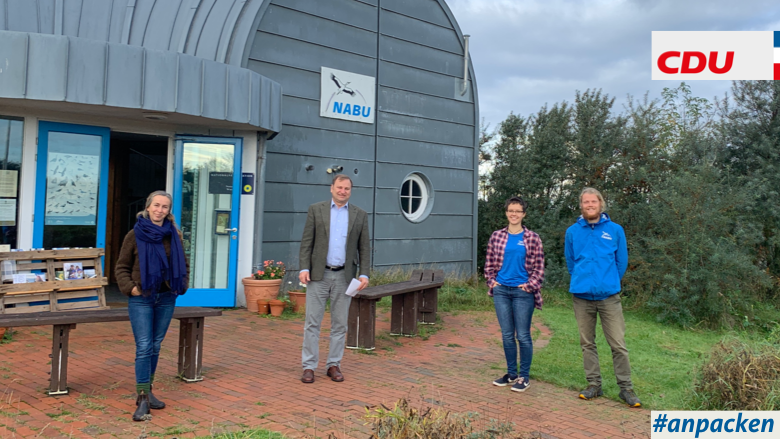 Im Gespräch mit den aktuell im Wattwurm zuständigen Nabu-Mitarbeitern Anne Evers, Justus Zietzsch und Martje Kölln erfuhr CDU-Landtagsabgeordneter Volker Nielsen mehr über die allgemeine aber auch in Corona-Zeiten besondere Situation der Nationalparkstation. Die 2007 überarbeitete und interaktiv gestaltete Dauerausstellung über den Speicherkoog und den Nationalpark Wattenmeer zieht jedes Jahr bis zu 5.000 Besucher in der kleine und für Besucher kostenfreie Infozentrum. In diesem Jahr musste der Wattwurm leider auf Grund der vielen interaktiven und aufwendig zu desinfizierenden Elementen und dem nur begrenzt möglichen Luftaustausch für den normalen Publikumsverkehr gesperrt werden. Die zwei bis drei fest im Speicherkoog stationierten Mitarbeiter des Nabus über den Bundesfreiwilligendienst haben daher in diesem Jahr kurzerhand einen Teil der Ausstellung im freien erlebbar gemacht und verstärkt Wattführungen und Wanderungen im Koog angeboten. Diese kurzweiligen Führungen durch die einzigartige Tier- und Pflanzenwelt wurden 2020 sehr gut angenommen und waren fast immer ausgebucht, sodass sich die verschiedenen Schutzstationen am Wattenmeer noch enger vernetzt haben und interessierte Besucher notfalls zu einer benachbarten Tour weitergeleitet wurden.