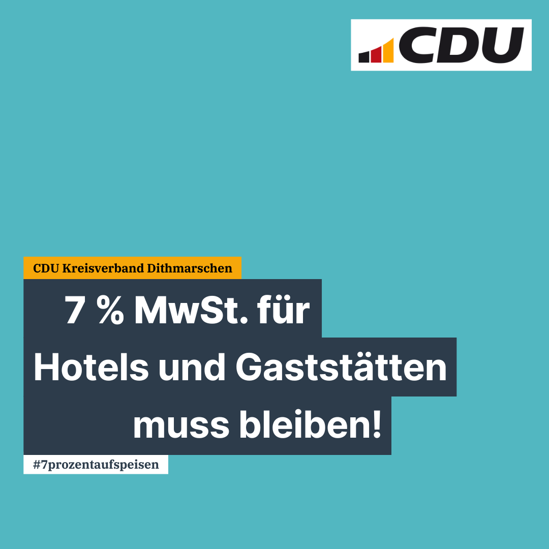 Die CDU Dithmarschen spricht sich dafür aus, die Reduzierung der Mehrwertsteuer auf 7 Prozent auch ab 2024 beizubehalten. Das Hotel- und Gaststättengewerbe zählt im Tourismuskreis Dithmarschen zu den wichtigsten Wirtschaftsfaktoren. Deshalb stehen wir an der Seite der Branche, die bereits seit Jahren in ganz Deutschland eine schwierige wirtschaftliche Situation hat und unter Fachkräftemangel leidet.